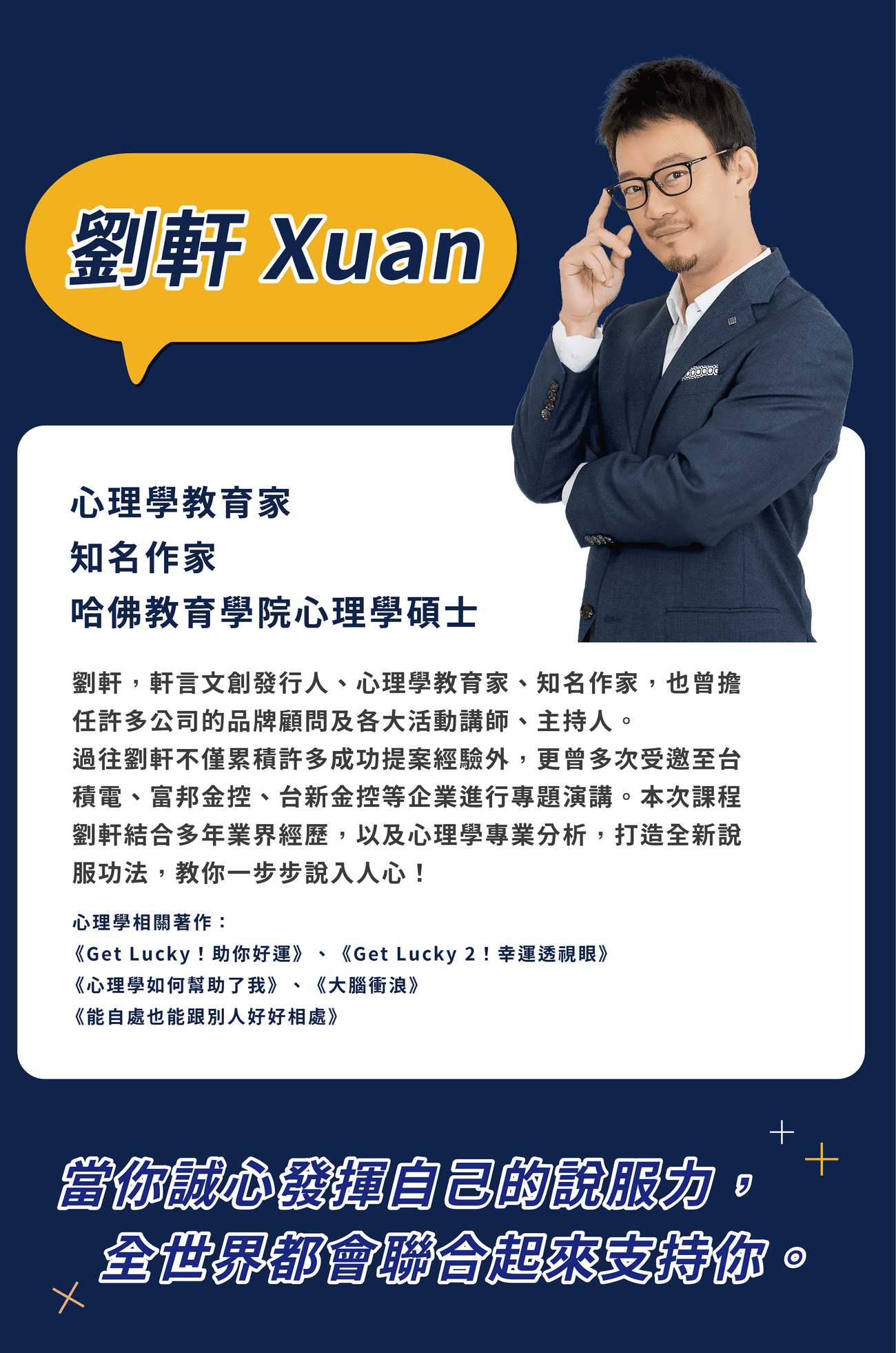 軒言文創發行人、知名作家,過去曾擔任許多公司的品牌顧問及各大活動主持人、DJ。畢業於哈佛大學心理系,有著專業的心理學背景,以及跨領域的精彩經歷。